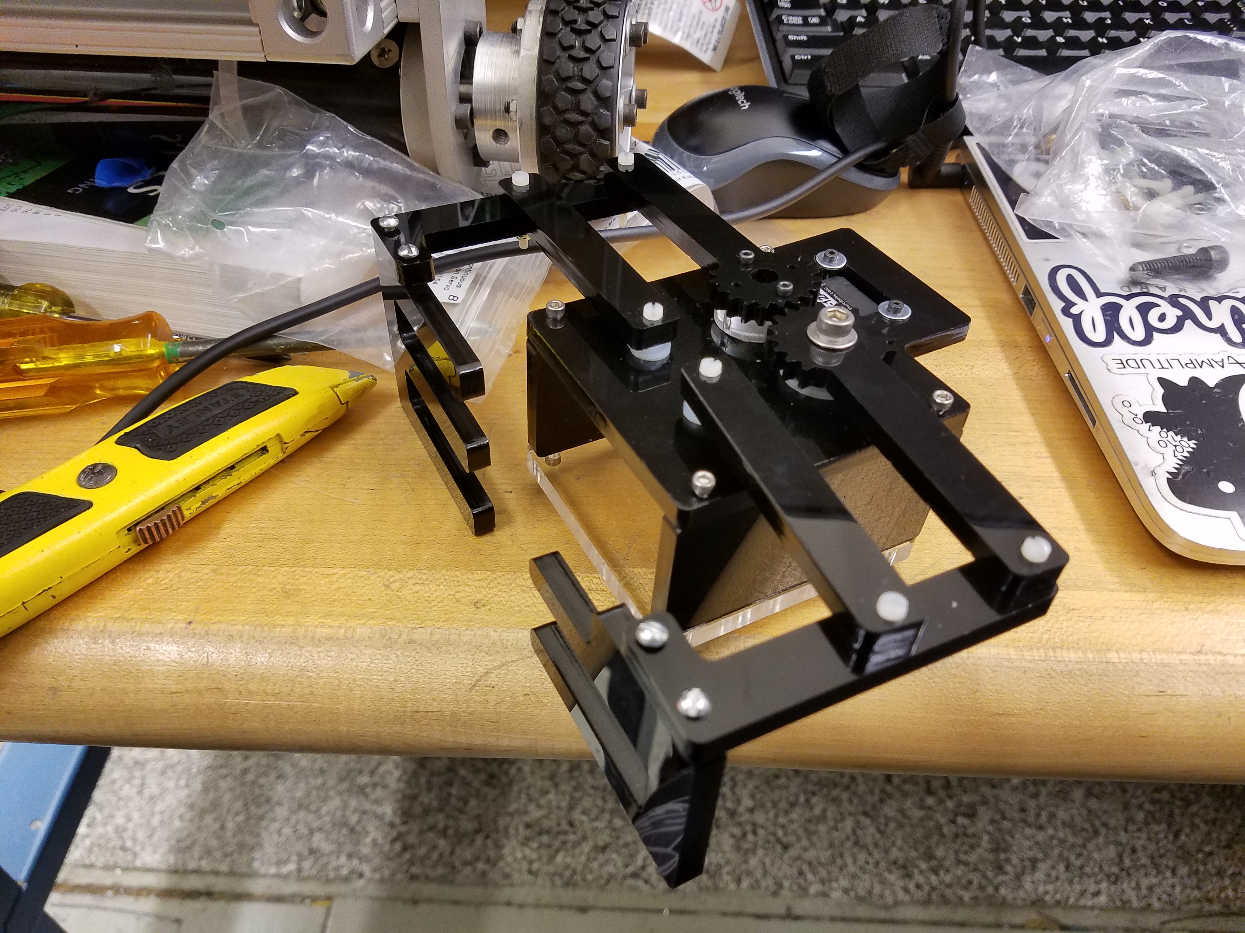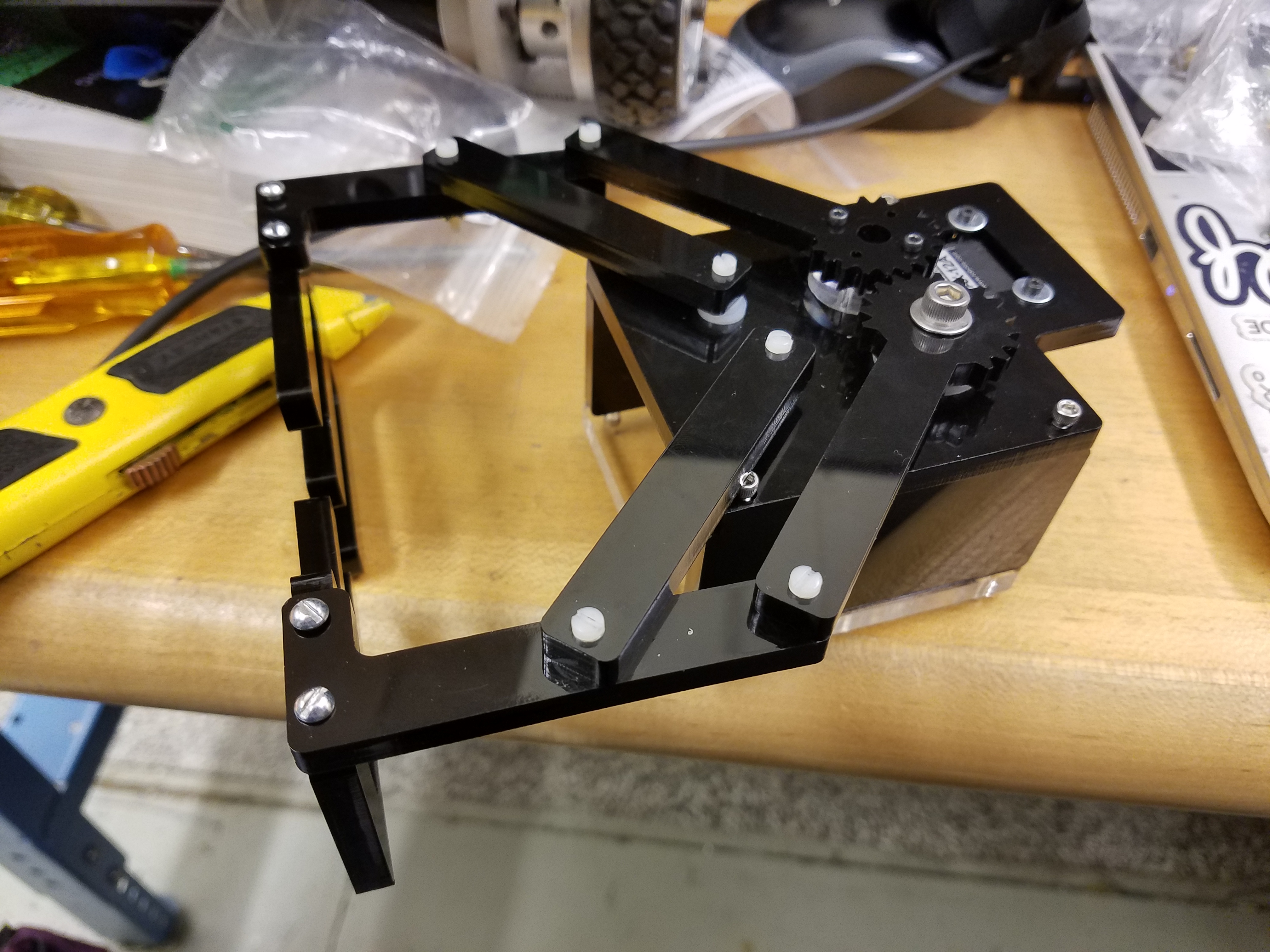 I was responsible for the design and maufacture of the 1-DoF, servo-controlled gripper end effector for the robot arm.
