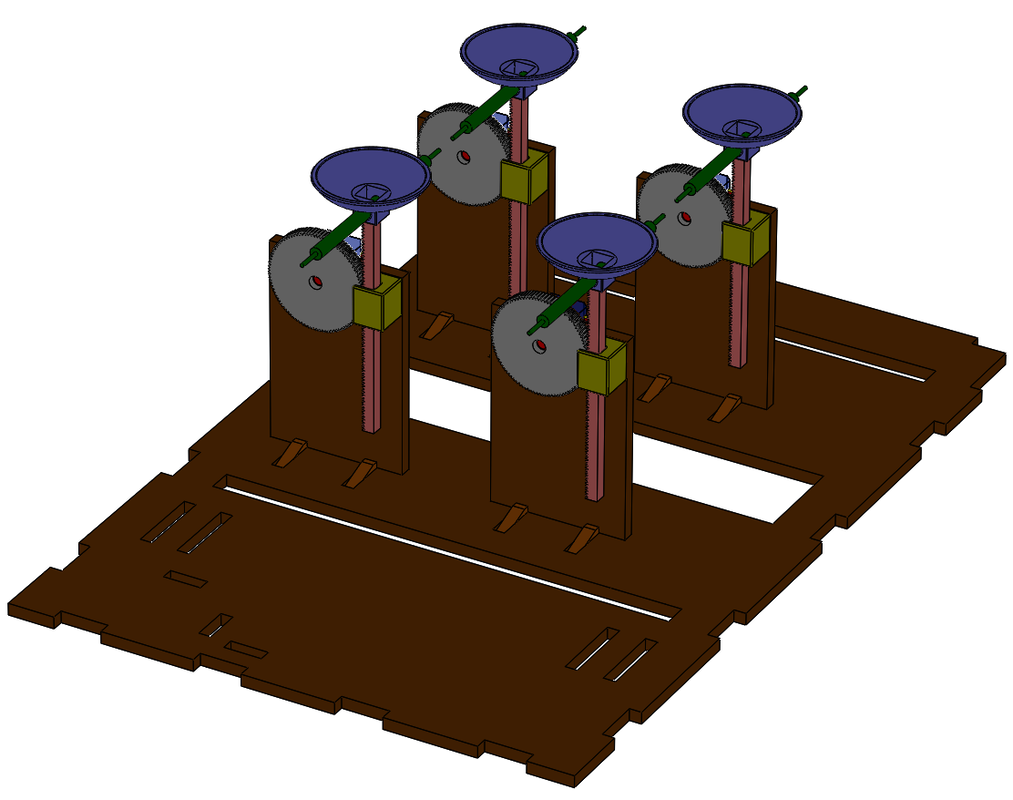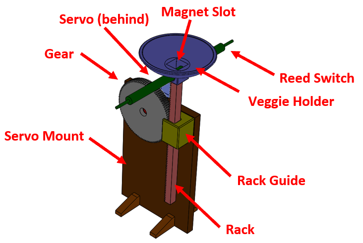 I was responsible for the complete mechanical design and manufacture. I designed and fabricated the chassis, rack and pinion risers for the produce, rocket, levers, and all electronic component mounts.
